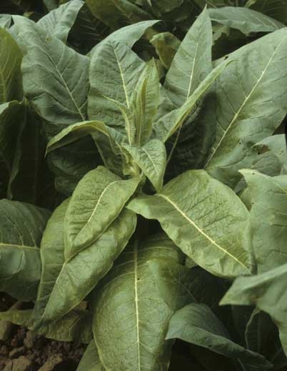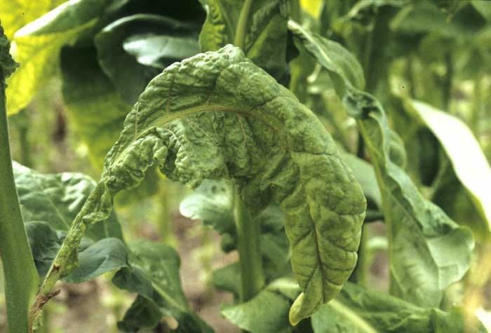 Infected leaves are sometimes small, crinkled and curled. If the infection occurs at early stages, growth can be greatly reduced (figure 13). The nature and intensity of the symptoms depends primarily on the strain of PVY involved, but may also vary depending on the tobacco type and variety grown.