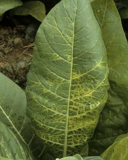 The characteristic symptoms of alfalfa mosaic virus (AMV) in tobacco consist of bright yellowing of leaf areas. The yellowing first appears on veins and surrounding tissues, on large tissue areas, forming broad rings and mosaic patterns (figures 1-3). Then the affected tissue may turn necrotic.