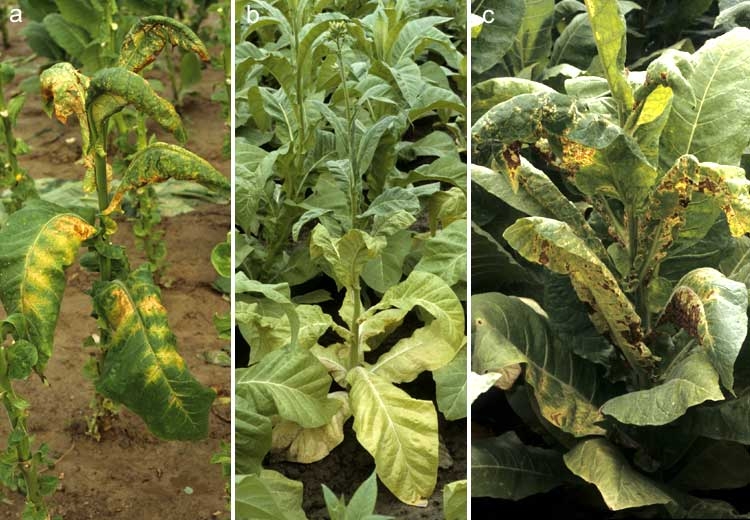 - either white spots, but mostly beige to brown ones of different appearance and size, sometimes growing near the veins (figure5a) (see Different viruses in the section of Leaf spots). Virginia tobacco varieties, with a resistance gene to Meloidogyneincognita, show rather specific symptoms when infected with PVY. This is often verified by the appearance of numerous small ecrotic lesions reminding of "etch" (figure 6b);