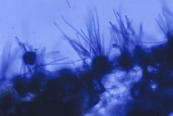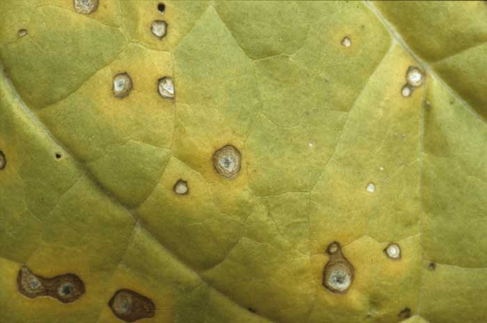 Frogeye lesions are small, circular, about 1 cm, light beige and parchment-like (figures 1 and 2). They can be covered by tiny black dots composed of clusters of conidiophores and conidia (figure 3). The spots are larger on mature leaves. They can develop during curing.