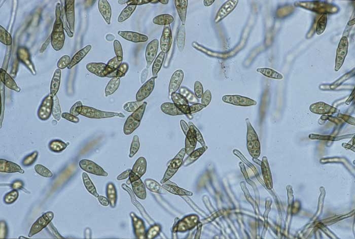 A few days after the appearance of spots and the invasion of necrotic tissue, if weather conditions are favourable, conidiophores bearing conidia (figure 2) are formed on the surface of damaged tissues, which will serve as secondary inoculum. Numerous spores are most commonly spread by wind over long distances or in a more limited way through the splashes of water, for instance on leaves and neighbouring plants.