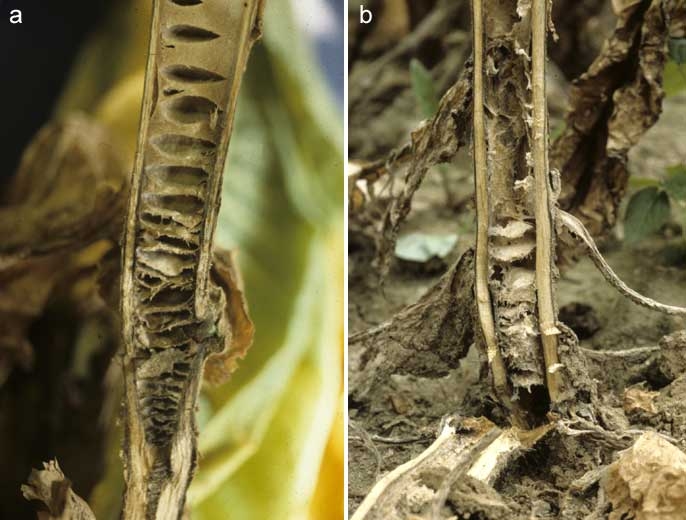 The disease is characterized by a rapid yellowing and wilting followed by death of the entire plant. A dark brown to black, somewhat sunken, lesion usually appears on the stalk(stem) at or near the ground level. This lesion often extends up the stalk or shank of the plant causing it to turn black. Stalks, when split, usually reveal the blackened pith separated into discrete disks. This feature is of diagnostic value only when used in conjunction with other observations because disking may occur due to other factors. In field observations, it has been noticed that some of the newer varieties, particularly the ones that have the ph gene do not exhibit any disking in the pith. The pathogen may infect also leaves if splashed on the lower leaves causing large brown lesions.