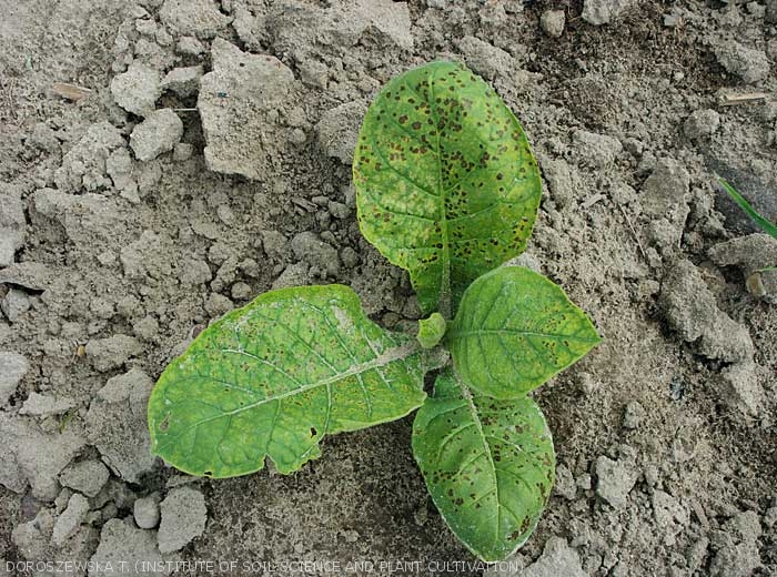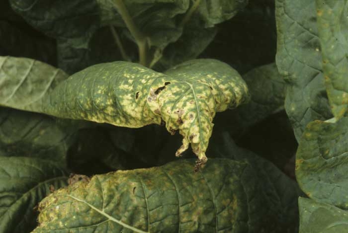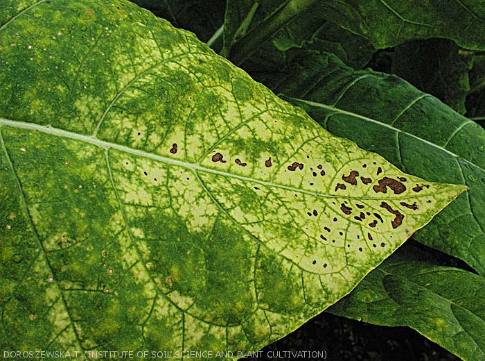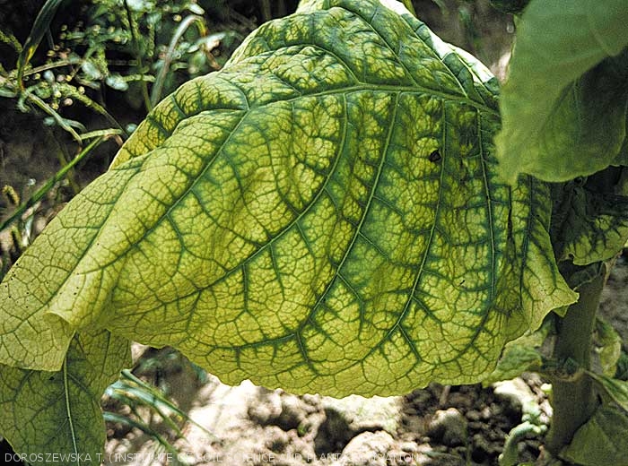 a diffuse mottling or chlorosis rather localised on the lower leaves, with or without necrotic spots and / or slight drying out;