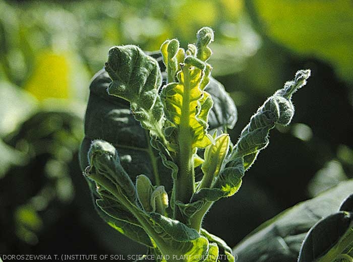 - Boron deficiency (B): young leaves are distorted. The lamina at the leaf base turns light green and can break down later. The leaves show large deformations and the terminal bud may die or stop growing (figures 8 and 9). Boron is involved in calcium utilisation. This trace element is a co-factor in the synthesis of nucleic acids and it is involved in membrane integrity.