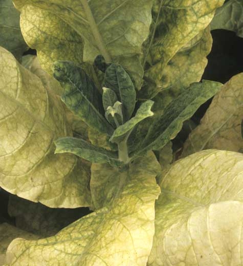 The disease starts as a leaf yellowing, which is first interveinal, occuring most frequently on older leaves or middle leaves and gradually covers the whole plant (figures 1-3). In dark tobacco leaves, veinal and interveinal necrosis occasionally accompany a slight chlorosis of the lamina (figure 4); the observed syndroma may be confused with that caused by certain necrotic strains of potato virus Y (PVY), see the fact sheet.