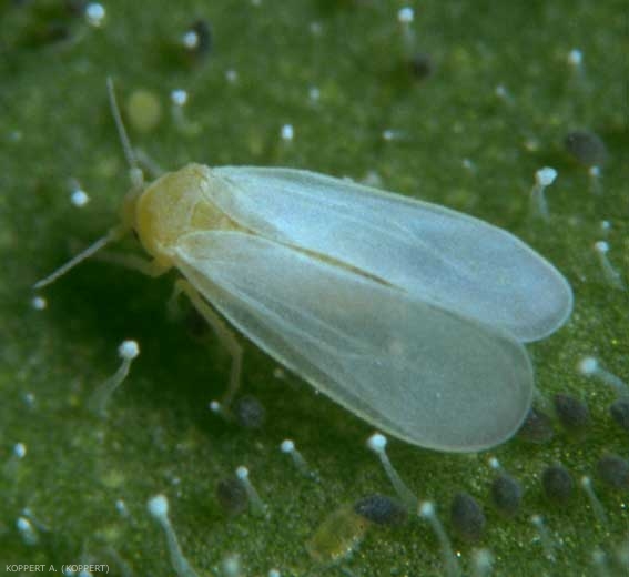 - Dispersion in the crop : concentrated in a few plants at the start of an infestation, the adults easily fly in the greenhouse and disperse as the size of the plants and temperatures increase. The wide distribution of plants of horticultural species in particular has largely contributed to the dissemination of B. tabaci throughout the world.