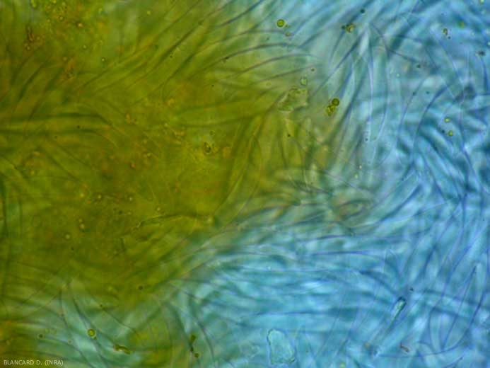 Many Fusarium sporulate profusely on damaged tissue or nearby: sporodochia (Figures 1 and 2), macroconids (Figures 3 and 4), microconidia, and chlamydospores may be formed. This potential inoculum represents important sources of contamination at the origin of the very easy dissemination of these fungi. They are dispersed in particular by wind, splash and runoff of water, equipment and tools. Note that during tillage, the inoculum is redistributed in the plot and disseminated by the tillage equipment.