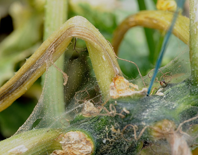 A characteristic, delicate silky webs are visible within the plant canopy, for example on the leaves (figure 6), along the stem (figure 7) ...