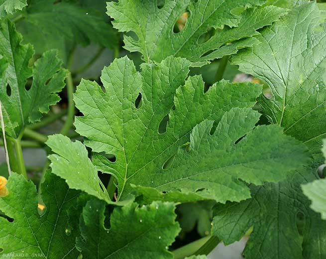 Honeydew is also produced in large quantities. This is then colonized by the opportunistic fungi responsible for sooty mold (figure 2). The mold produced covers the surface of the aerial organs of zucchini and squash and spots them; the fruits sometimes become unsuitable for