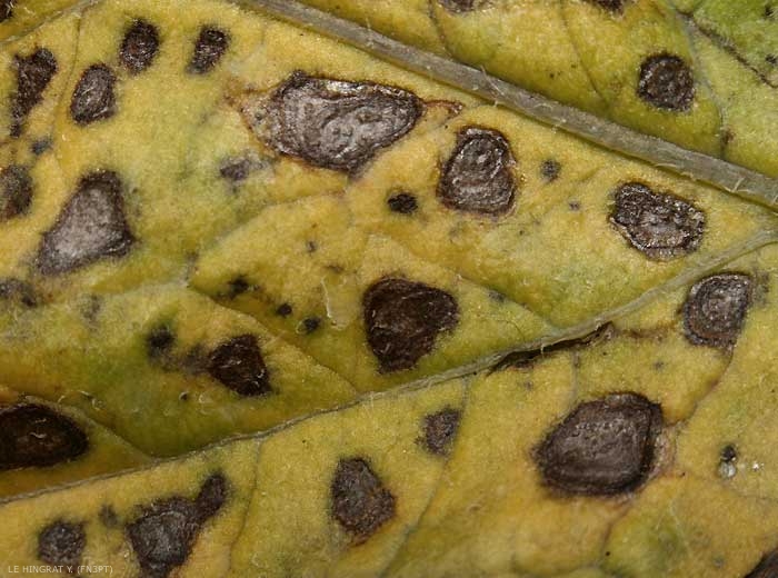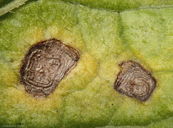 There are clearly delimited necrotic spots, of variable size which are mainly located on the bottom leaves and concentric rings on the larger spots (photos 1 to 3). Symptoms usually appear on the bottom part of the plant where the leaves are older and start senescing (photo 3 to 6)