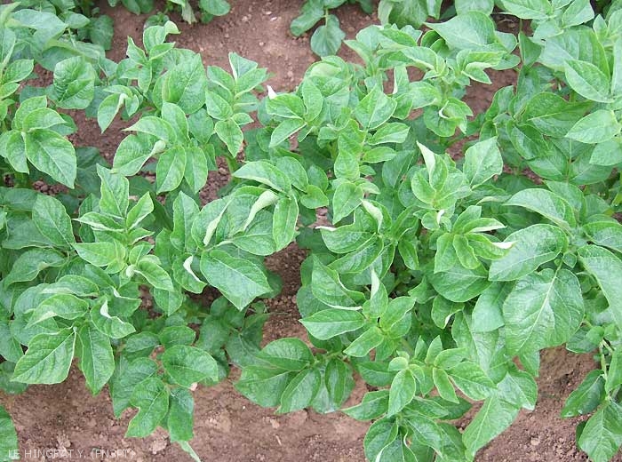 Typical symptoms of PVM have been called paracrinkle or potato leaf rolling mosaic as they have the appearance of rolling in the top of the plants (photo 1) with mild mosaic and ”spoon-shaped” rolled leaflets. Leaf rolling due to PVM is soft when touched whereas Potato leaf roll virus induces a «cracking» leaf rolling. It occurs in developed plants, usually on the top leaflets.