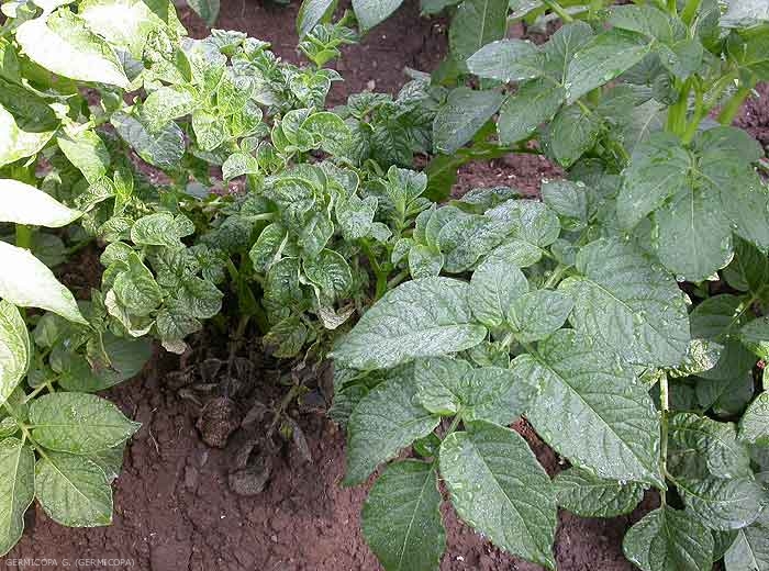 Secondary infection, i.e. infection resulting from tubers contaminated from the previous year, produces more severe symptoms, which vary widely with the infected cultivar. One of the three following types can usually be observed: