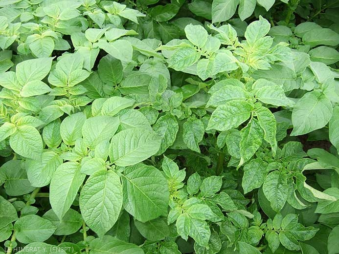 - mosaic pattern or mottling : alternating patches of light green and dark green areas without any leaf distortion, more or less visible depending on the potato cultivar and the climate (usually more visible in overcast weather) (photos 9 to 11).