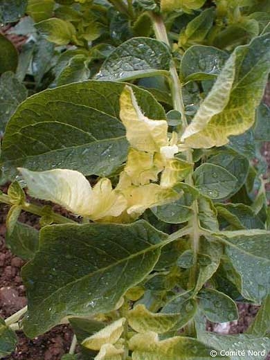 - yellow and/or white discolouration of the upper leaves; brown necroses can then form on the most affected leaves. These injuries are caused by products whose active ingredients target the photosynthesis or the production of certain pigments, e.g. metribuzine, linuron, clomazone, and aclonifen.