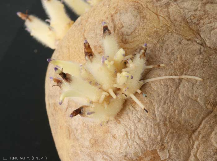 Symptoms of deficiency: the young leaves and the leaf tips become chlorotic, smaller and slightly curled (photo 1). In the case of severe calcium deficiency, plants may be stunted. As calcium is not very mobile in the plant, symptoms are typically located on the apical parts of the leaves, stems and sprouts. Necrotic and black tips on the sprouts (photo 2) as well as tuber internal rust spot are sometimes related to a lack of calcium availability.