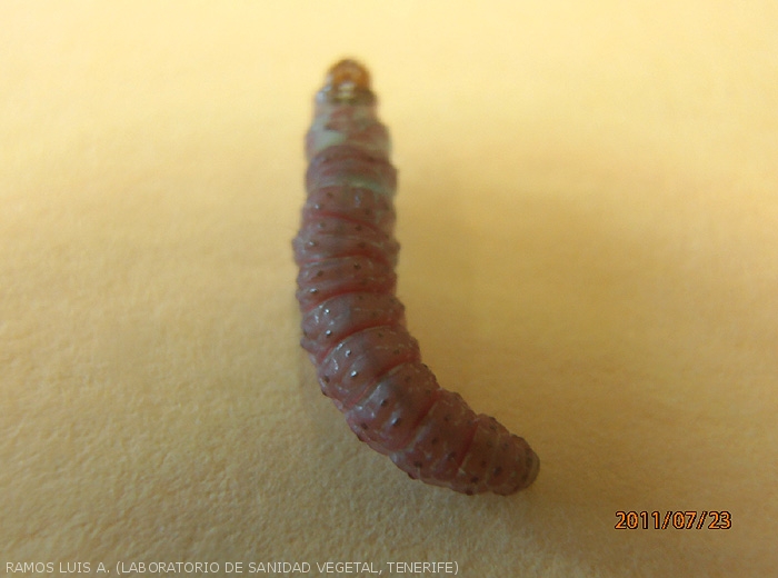 The adult is a small dark to light brown moth (photo 1) with a wingspan of 15-22 mm and the larval stage (photo 2) is the most devastating (photos 3 and 4).