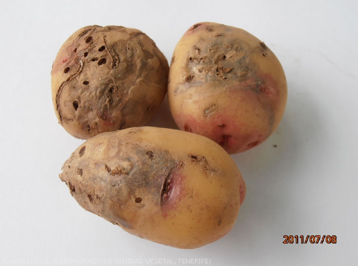Dégâts sur tuberules de la Teigne du Guatémala, Scrobipalpopsis (Tecia) solanivora