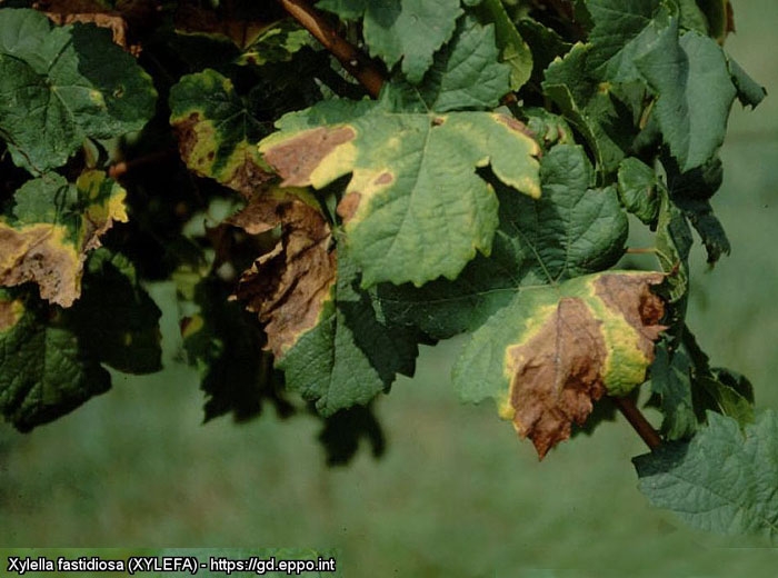 The first symptoms of Pierce's disease are foliar and appear especially during hot, dry summer periods, or when vines are under water stress. Thus, russeting and partial drying out of the leaves occur. The lesions of the limbus in green are sectorial and / or peripheral, brownish in color, yellow to reddish on the border. The withering of the leaf blade gradually spreads, and subsequently entire leaves necrotize and drop, only the petioles remaining attached.
