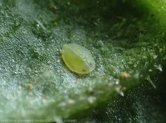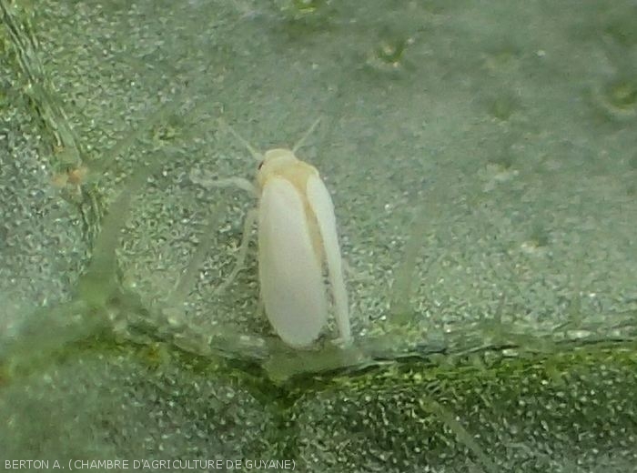 - The adults resemble almost entirely white midges, about 1 to 3 mm long depending on the species, and are mostly found on young leaves. The larvae, flattened, have an oval shape and are whitish or dark in color, covered or not with white waxy secretions depending on the species, which allows them to be recognized. However, the color of the larvae can change if they are parasitized by microhymenoptera. These larvae can be confused with mealybugs, but these are rare on vegetable crops and we will not observe "white flies" in this case.