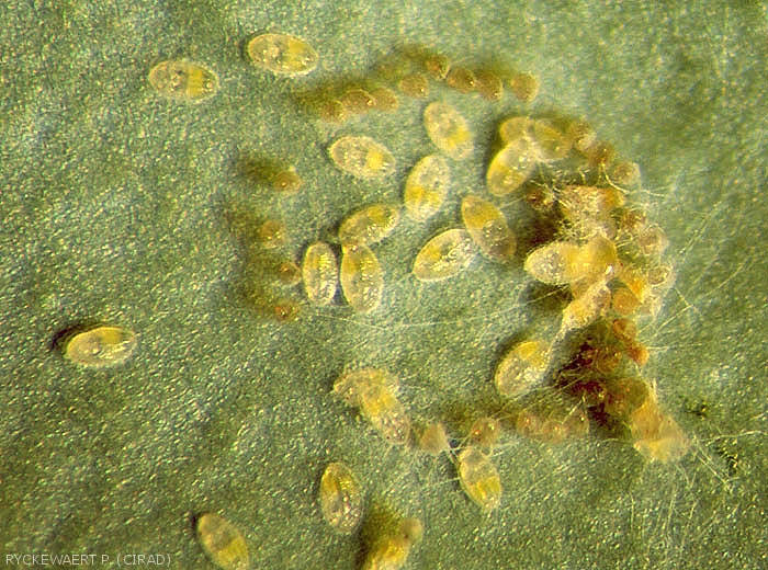 - Dispersion : Les adultes volent peu mais sont facilement emportés par le vent, et se dispersent rapidement dans les cultures. La diffusion de plants infestés contribue à la dispersion de ces insectes.