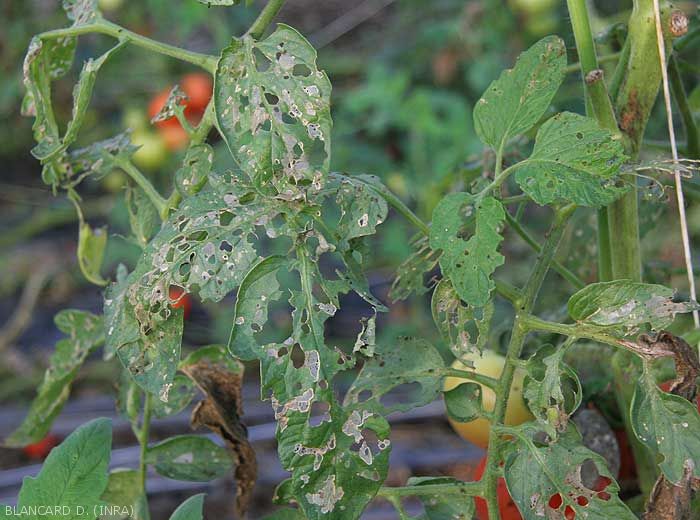 - Consumption of tips and leaves and leaflets by the larvae, especially the older ones. They form large holes located on the leaf blade or at its periphery, sometimes leaving behind only the main veins and thus greatly reducing photosynthesis.