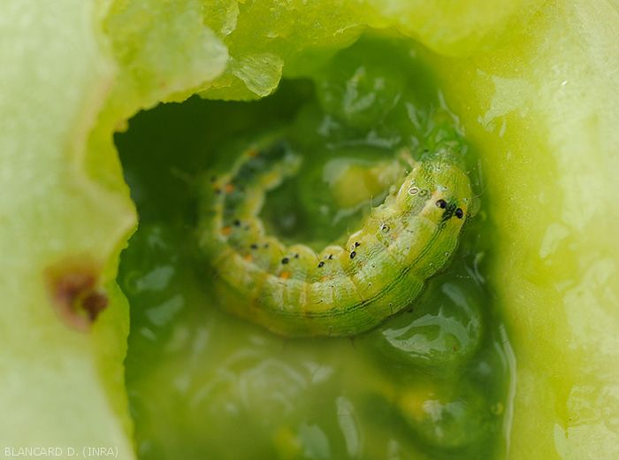 - Perforation of stems and fruits which they subsequently invade. In addition to the perforations, galleries and cavities are observed. Many droppings are visible inside and also outside. Parasitized fruits, for example tomato, stop growing, ripen prematurely and fall off. Note that these perforations facilitate the penetration of many rotting agents, such as Choanephora cucurbitacearum , etc.
