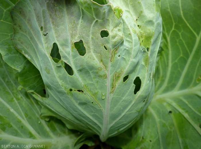 - Leaves with holes, cut after consumption of the blade by the larvae, considerably reducing yield.