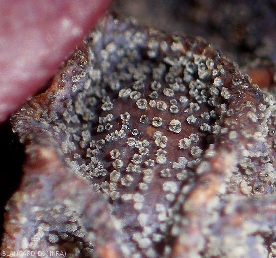 The imperfect form of Pilidiella diplodiella produces pycnidia subglobular (100-200 µm in diameter) on injured tissue (Figures 1, 2 and 7). These have a central ostiole and gradually turn brown (Figure 3).