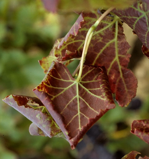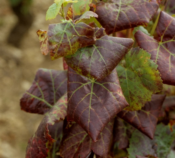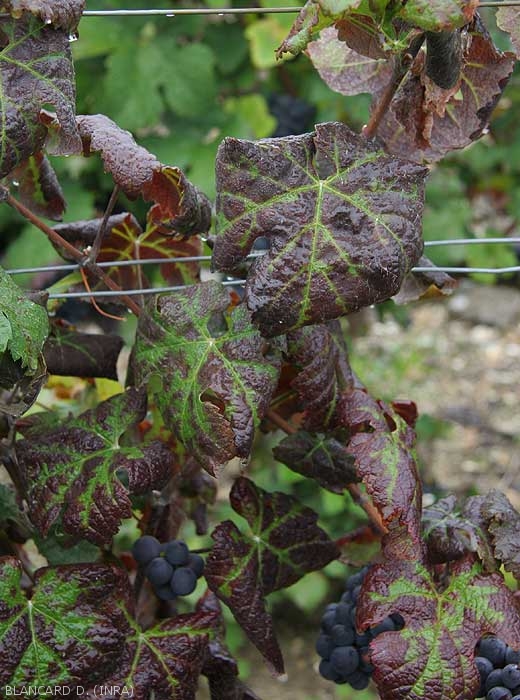 - On red grape varieties, the leaves located on the lower part of the twigs turn red in more or less large spots due to the accumulation of anthocyanins, while the main veins remain green (figures 1 to 4) and the blade thickens . The reddening becomes progressively general in the limbus (Figures 7 to 14). Note that at the end of the season the affected leaves turn brown and die off.