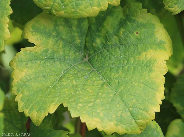 - On white grape varieties, a diffuse yellowing gradually appears on the leaves in the same way. It is rather difficult to differentiate these discolorations from other symptoms, such as those of deficiency or phytoplasmosis (Figures 15 to 17). On these grape varieties, the disease is therefore more insidious and can go unnoticed.