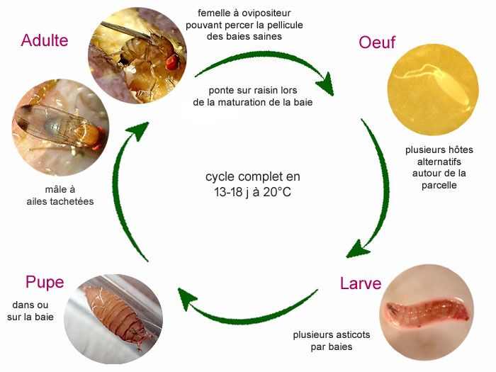 Females can lay several eggs per day, on different fruits (cherry, mistletoe, cherry laurel, wild blackberry, American grape, hièble elderberry and black elderberry, species present around the vineyard), with a total fertility that can be greater than 400 eggs per female. The eggs are inserted into the bay and it can accommodate several larvae. Thanks to its robust ovipositor, this fly lays on healthy fruit with a thin film, but it can also lay on injured fruit.