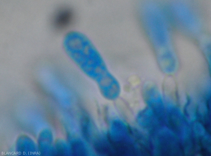 • Sporulation, dissemination of fungi : fairly rapid production of acervuli on lesions present on berries. Conidia grouped together in the form of mucus are dispersed by water and splashing water, by the wind carrying fine water droplets, by workers and farm tools, and by some insects. They provide secondary contamination at the end of summer. Ascospores produced in perithecia are dispersed by the wind during humid climatic periods.