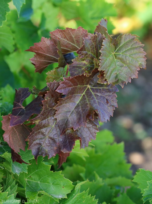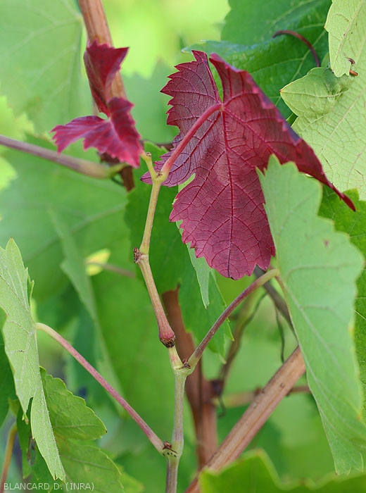 All the grape varieties do not seem to react in the same way to egg-laying bites, where the reddening is more or less marked. Apart from the vine, many plant species can be parasitized by the hartebeest leafhopper, fruit trees such as apple or plum , walnut and hazel, as well as ornamental shrubs or conifers (poplar, lime, dogwood, oak, lilac, etc.) and market garden plants.