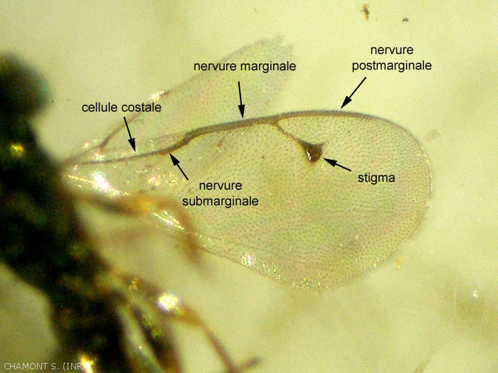 They are also very small insects (0.5-1 mm) with an equally compact body, for the same reasons as in the encyrtidae. They never show a metallic sheen, their body being either entirely yellow, or entirely dark brown, or even with a mixture of the two colors (figure 3). The antennae are 3 to 8 articles, the marginal vein of the forewing is long, but the stigma is very short. The ovipositor is not very visible.