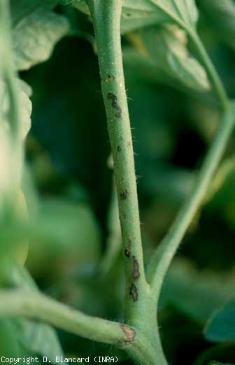 - Pseudomonas syringae pv. tomato, responsable de la moucheture (bacterial speck), est à l'origine de petites taches de 1 à 2 millimètres de diamètre, irrégulièrement arrondies, de couleur brune. Ces taches sont cernées progressivement par un halo jaune assez marqué (figure 1). Si les conditions sont particulièrement humides, elles s'étendent, confluent et altèrent des secteurs entiers du limbe. Des lésions brunes, allongées, peuvent se développer sur les pétioles, les tiges (figure 2) et les inflorescences à l'origine, dans le dernier cas, de chutes de fleurs.