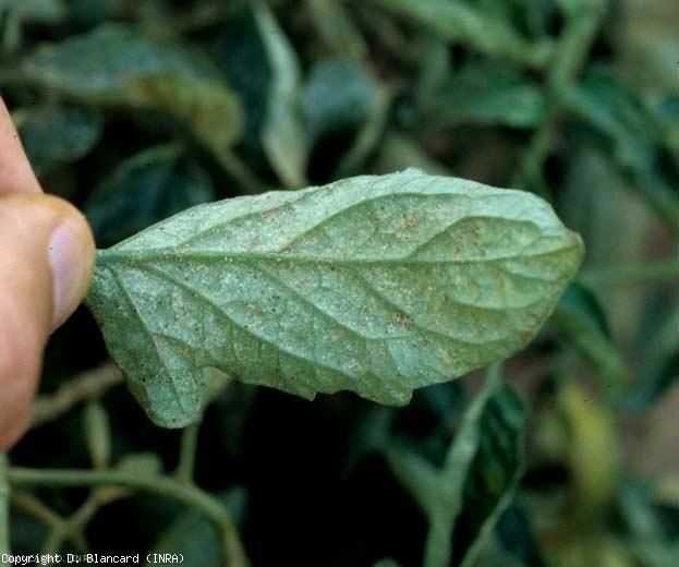 De minuscules taches chlorotiques plus ou moins dispersées sur le limbe des folioles de tomate (figures 3 et 4). Ce dernier jaunit progressivement et prend une teinte terne. Lors d'attaques sévères, certaines feuilles peuvent jaunir, flétrir et se dessécher . De délicates toiles soyeuses sont visibles au sein du couvert végétal (figure 5).