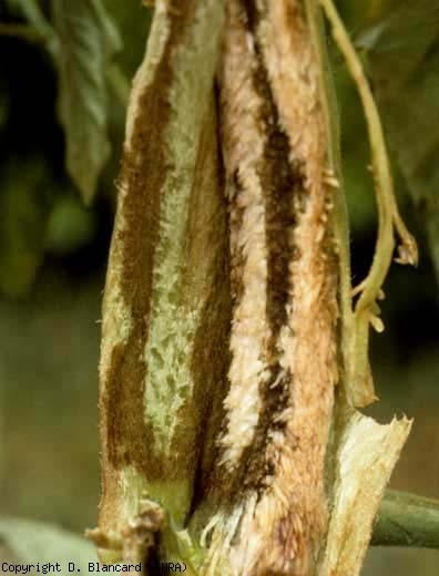 Diseased plants see their growth blocked. Young leaves gradually chlorinate and sometimes wilt (Figures 1 and 2). Elongated, brown to black, irregularly shaped lesions are visible on the surface of the stem (Figures 2 and 4), and sometimes petioles (Figure 3). In some situations, bacterial exudates bead up on the surface of the leaflets . It should be noted that some stems become quite brittle. A longitudinal cut in the latter shows that the marrow is affected. This first takes on a translucent appearance and a pale brown tint, then gradually darkens (photo 606) ; it can also hollow out and retract to form several cavities which alternate more or less regularly with parts still intact. The T vascular derived may have a brownish color.
