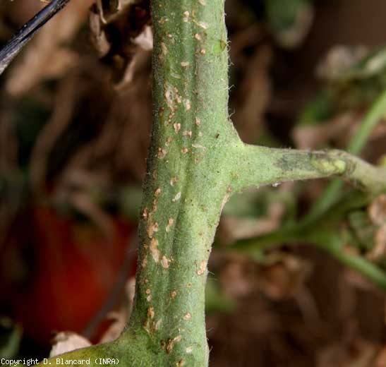 - small lesions a few millimeters in diameter, initially whitish and quickly becoming canker, appear on the aerial organs of the tomato. These small superficial cankers, which slowly necrotize, are rather rare on leaflets , more frequent on the stem (figure 7), petioles and fruits (figure 8). On the latter, they often have a particular appearance: small circular white spots and flat on the periphery and whose center is more in relief, sometimes burst, beige to ocher in color. These characteristics give them the appearance of a bird's eye spot (figure 8). In addition, the emission of adventitious roots can take place on the stem.