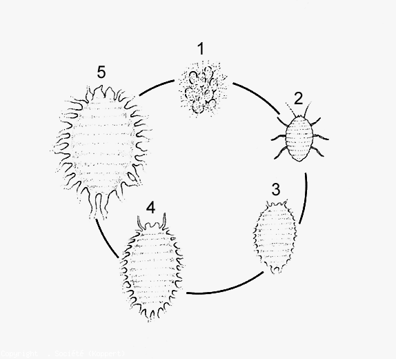 - Developmental stages: the eggs (figure 4-1) are laid inside a white waxy ovisac. After hatching, the first instar larvae (Figure 4-2) disperse on infested plants. After the second larval stage (figure 4-3), this insect will form two successive false nymphs in which the males will undergo a metamorphosis. These have the appearance of small winged midges, whose life is ephemeral. Females (Figure 4-4) (Figures 5 and 6), measuring 4 mm in length, do not undergo metamorphosis and therefore do not change shape. The pinkish color of their body is masked by white mealy wax.