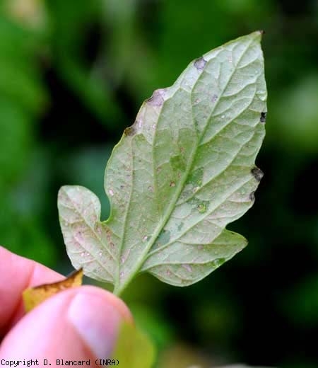 Silver lesions, irregular in size and shape, appear on the limbus; they gradually necrotize and take on a beige tint (Figures 2 to 4). These lesions are also strewn with tiny black dots materializing the droppings of thrips . Affected leaflets tend to chlorinate and take on a dull color. Flower falls may take place. oviposition sites F. occidentalis on young fruits, appearing as brown punctate lesions, are surrounded by a large whitish subepidermal ring (Figure 5). Sometimes the more or less deformed fruits show linear corky lesions.