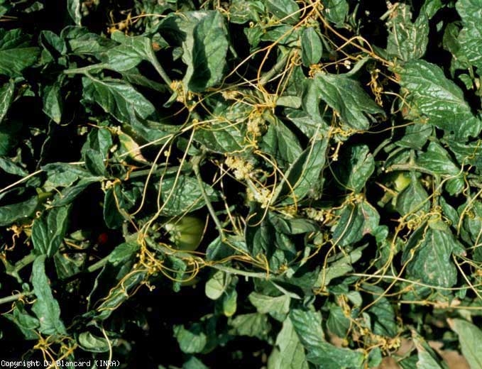 The control of these parasitic plants is particularly difficult due to the presence of numerous dormant seeds present in the soil and their broad host spectra. Among the vegetables, we can mention asparagus, beetroot, carrot, eggplant, asparagus, onion, melon, pepper, potato Several weeds can be parasitized ( Amaranthus sp., Chenopodium album , Convolvulus arvensis ). It is therefore necessary to implement in a complementary manner measures such as the application of long crop rotations with non-host plants (cereals, beans, cotton, maize, sorghum), the use of pre-emergence herbicides or of contact. Furthermore, seeds should not be introduced into a plot via irrigation water, in particular, seeds or plants. The first focus (s) observed must be destroyed as quickly as possible by burning the infested plants, preferably before flowering. It is desirable to plant tomatoes outside the periods of emergence of dodder seedlings. Tillage equipment, tools and workers' shoes must be cleaned after each intervention in an infested plot. Note that solarization would not completely eliminate the seeds of dodder present in the soil, composting seems to be more effective. Finally, several microorganisms are likely to infect dodder, including Alternaria alternata and Geotrichum candidum on Cuscuta pentagona . A few varieties of industrial tomatoes ('Heinz 9492', 'Heinz 9553' and 'Heinz 9992') have been shown to be tolerant to attack by this species. On these varieties, the first stages of the parasitic process of the dodder go well but, thereafter, many suckers formed seem unable to penetrate into the stems. Thus, the rate of parasitism is greatly reduced, as is the development of dodders.