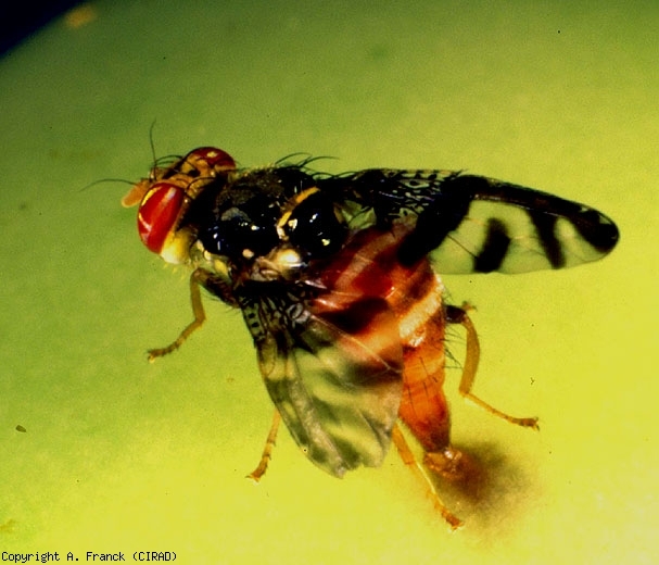 Mating begins very early after the emergence of adults (from 48 h), and can take place from morning until mid-afternoon, with a maximum frequency in the middle of the day. Like most other Tephritidae species, males attract females by emitting an active sex pheromone at close range. The laying of females begins 4 to 6 days after mating. Using their pointed oviscapte, the females deposit their eggs under the epidermis of the host fruit, a few millimeters deep. Egg-laying activity usually takes place in the afternoon, with a maximum between 4 and 5 p.m. The eggs hatch after 3 to 4 days of incubation. The larvae then sink into the fruit pulp where the larval cycle, which includes three stages, lasts from 7 to 11 days. At the end of development, the maggots leave the fruit with a sudden relaxation to sink shallowly into the soil, where pupation takes place. The stage pupa lasts 2 to 15 days. Thus, depending on the climatic conditions, the complete cycle is spread over 26 to 35 days. Studies of visual attractive stimuli show that adults of both sexes are preferentially attracted to fluorescent yellow, while mature females are strongly attracted to bright orange spheres. The study of attractive olfactory stimuli for adults should soon provide a suitable trap for monitoring populations.