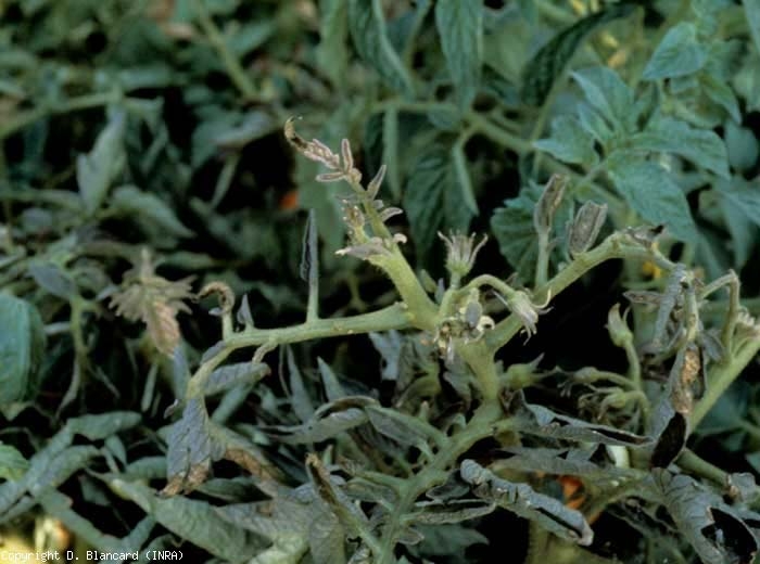 The phytoplasmas attacking the tomato cause various symptoms on the aerial organs, young and growing, of this nightshade. In France, they often appear during the month of July, or even early August. From this period, the growth of affected plants is often slowed down . The apices form shorter internodes and smaller leaves, sometimes rolled up. The lamina tissues are often thicker and even brittle (Figures 1 to 3).