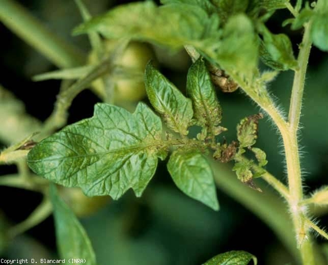 Of necrotic lesions , longitudinal and unilateral, may then appear on the rods of a length up to 20 cm (Figure 2). The apical buds are sometimes completely destroyed by necrosis, as well as the neighboring young leaves.