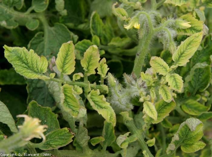 Generally, plants affected by the tomato ( yellow leaf curl virus Tomato yellow leaf curl virus , TYLCV), a Begomovirus strictly dependent on phloem, see their growth slowed down or even blocked (Figures 1 to 4). They take on a puny and bushy appearance, because of the development of numerous axillaries, and the reduction in the length of the internodes. In the case of early infections, they remain dwarf and do not produce fruit.