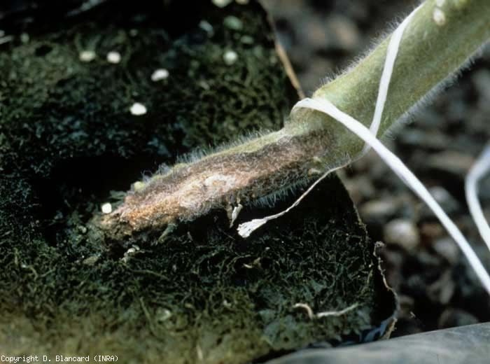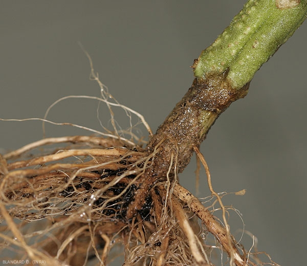 Fusarium oxysporum f. sp. radicis-lycopersici can attack seedlings tomato and cause their death . The disease is expressed mainly near the harvest; when the plants are loaded with fruit. Unlike vascular diseases in particular, wilting more or less severe appears on the leaflets and leaves at the top of the stem; in this zone, the rod is also strongly thinned. Depending on the plants, these wilts may initially be reversible during the night, and their incidence may fluctuate depending on climatic conditions. They can also be sudden, progress very quickly to necrosis and drying out of leaflets and leaves, and lead to the death of plants. Some authors also report the appearance of leaf yellowing located at the periphery of the blade of old leaves. These are followed by petiole necrosis and leaf drop. Some plants affected early see their growth reduced.