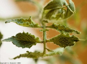 - - the more or less marked distortion and / or curling of the leaflets, which may be shorter, threadlike and present strongly thickened tissues (figure 11);