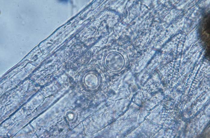 Seule l'observation d'oospores (parfois d'autres structures comme les sporanges ou des chlamydospores) sur et dans les tissus affectés, ou la réalisation d'isolements sur milieux artificiels, permettent de diagnostiquer avec certitude l'intervention de ces champignons (Figure 3).