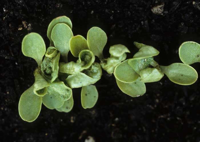 Certains pesticides peuvent être à l'origine de phytotoxicités induisant des modifications plus ou moins marqués du port des salades, des malformations foliaires et une réduction, voire un arrêt total de la croissance des plantes. Les figures 1 à 6 permettent de se faire une opinion sur la nature et l'intensité des symptômes induits par certains composés phytotoxiques. On peut notamment observer :- des limbes légèrement dentelés ou plus irrégulièrement découpés (figure 1) ;