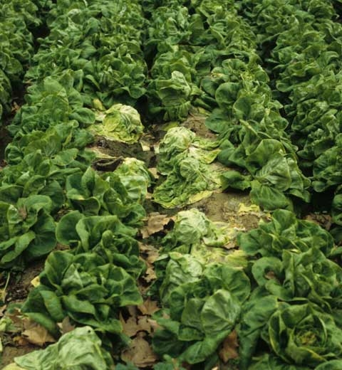 - des conditions climatiques. Des températures élevées, une période ventée, augmentent l'évapotranspiration des plantes et favorisent ainsi le flétrissement précoce des salades. A l'inverse, dans des conditions de faible évapotranspiration, lors d'un printemps froid et humide par exemple, les plantes peuvent ne pas flétrir dans un premier temps, malgré un problème phytosanitaire survenant sur les organes signalés précédemment (chancre au collet, pourriture racinaire...) ; lorsqu'elles le feront, il sera souvent trop tard pour intervenir.